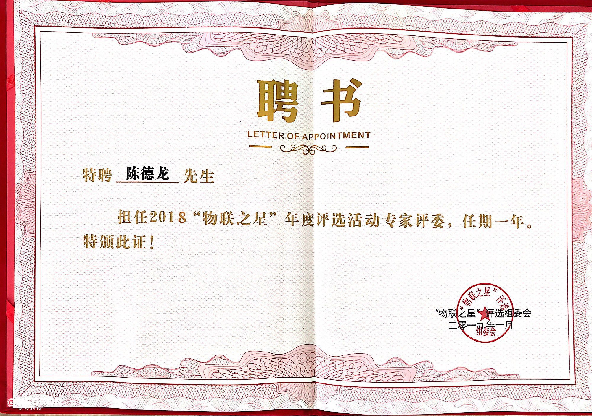 祝賀我司總經(jīng)理陳德龍先生,擔任“物聯(lián)之星”專家評委